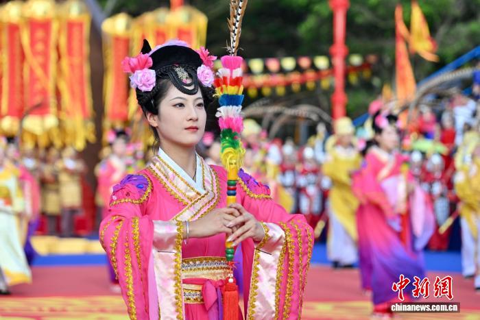 10月29日,海祭妈祖祝福年夜典上的乐舞上演。当日,为留念妈祖成仙降天1038周年,祸修省莆田市湄洲妈祖祖庙正在湄洲岛停山村深澳底妈祖祸舟举办海祭妈祖祝福年夜典。去自寰球各天的5000多实妈祖文明机构代替联合于此,协同祭拜妈祖。 蔡昊 摄